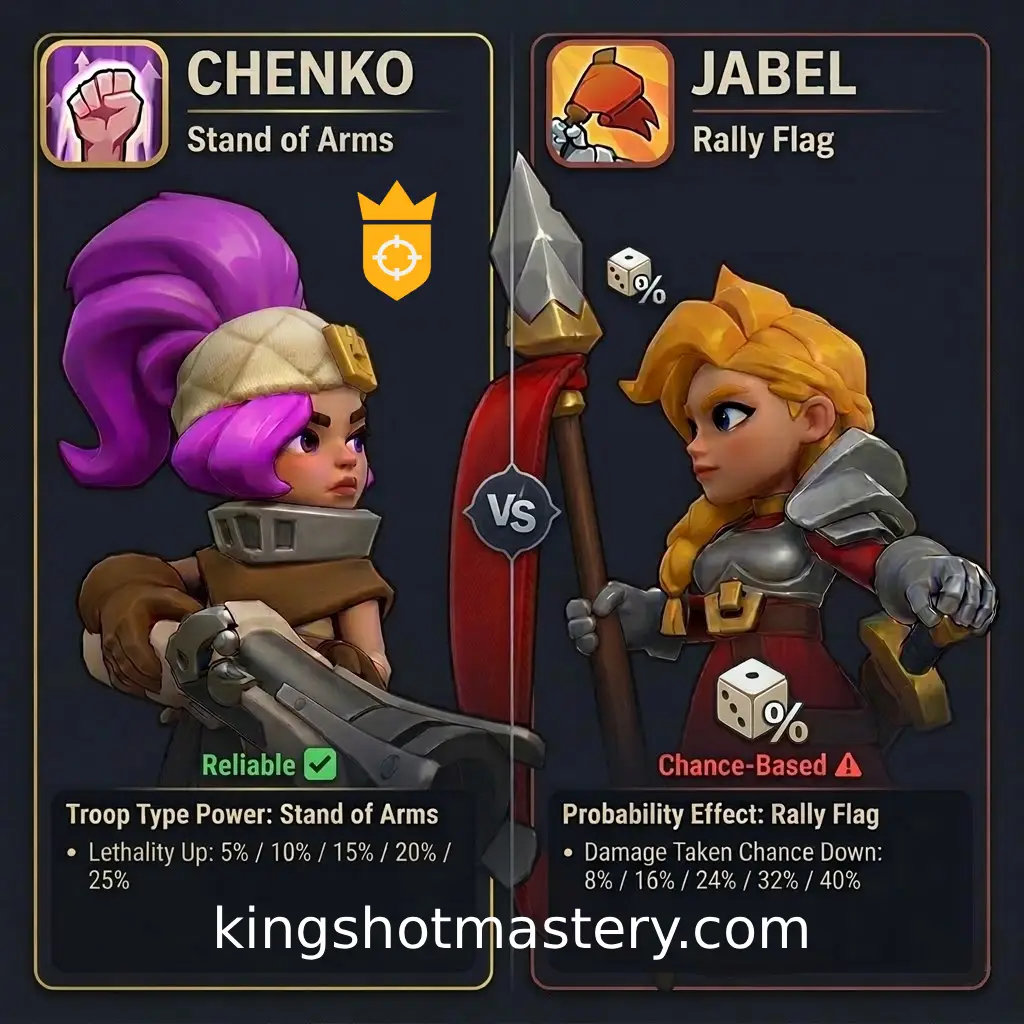 Chenko's first skill is a flat +25% Squad Lethality โ reliable, additive, stacks with other Lethality buffs across the rally. Jabel's first skill is chance-based: it doesn't fire on every hit, and chance-based skills don't stack with each other. Over hundreds of hits in 30 minutes, a consistent Lethality multiplier is far more valuable than a probabilistic proc. Four Chenkos in a rally compounds to a huge combined buff. Four Jabels gives the same result as one.