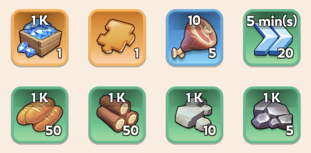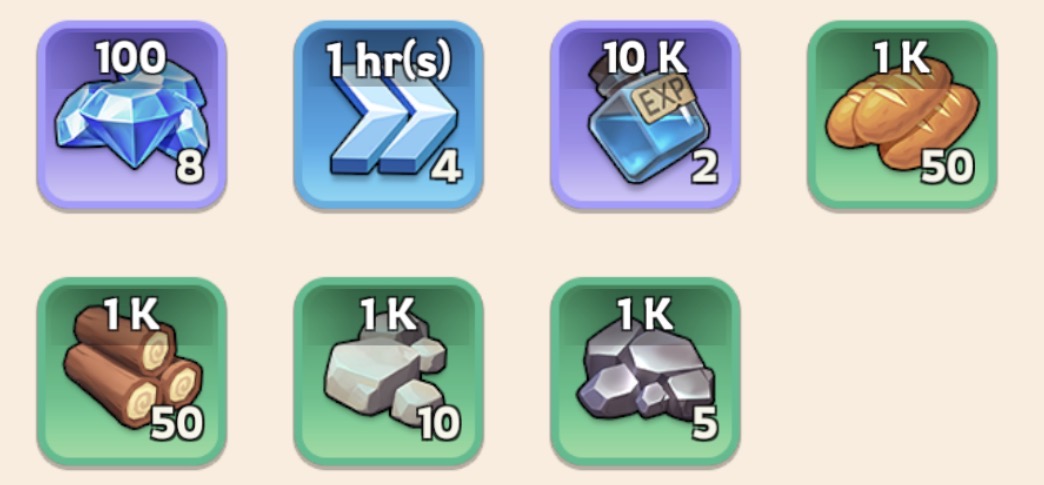 - Complete all Daily Quests (gems + speedups)